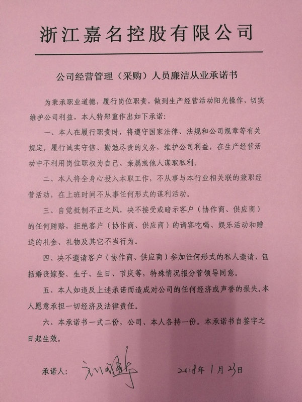 1月23日,公司召開經營管理(采購)人員廉潔從業(yè)承諾書簽訂會議,11名公司廉潔風險重點崗位的經營管理(采購)人員參加會議,并簽訂了廉潔從業(yè)承諾書。公司莫總和黨建指導員吳紀聯(lián)分別講話。
