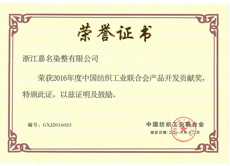 公司榮獲“2016年度中國紡織工業(yè)聯(lián)合會(huì)產(chǎn)品開發(fā)貢獻(xiàn)獎(jiǎng)”