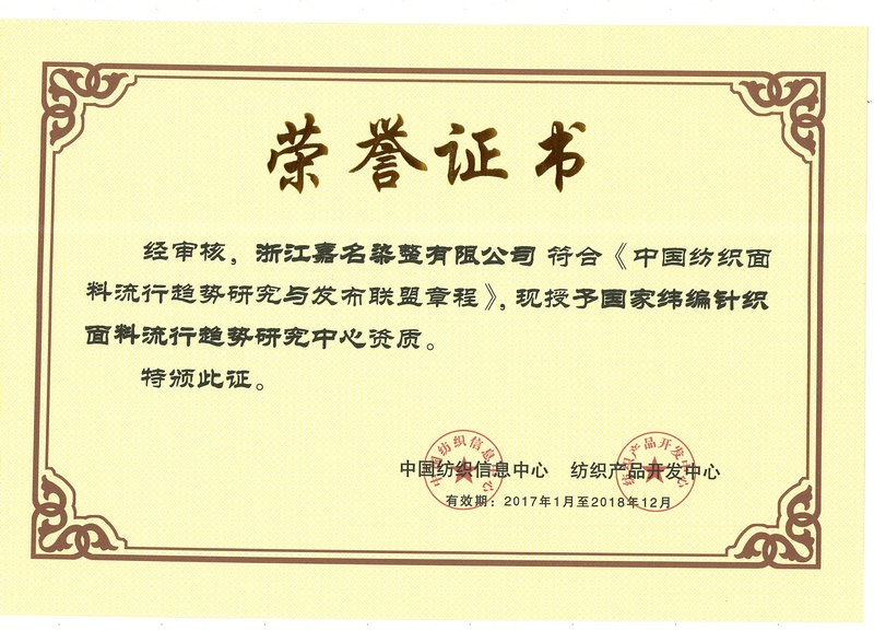 在中國紡織創(chuàng)新年會(huì)上,中國紡織工業(yè)聯(lián)合會(huì)授予“嘉名染整”“2016年度中國紡織工業(yè)聯(lián)合會(huì)產(chǎn)品開發(fā)貢獻(xiàn)獎(jiǎng)”;中國紡織信息中心、紡織產(chǎn)品開發(fā)中心授予“嘉名染整”“國家緯編針織面料流行趨勢(shì)研究中心資質(zhì)”